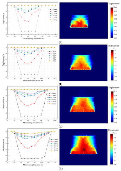 Movement law of overburden rock. (a) Working face advancing 20 m vertical displacement; (b) Working face advancing 30 m vertical displacement; (c) Working face advancing 40 m vertical displacement; (d) Working face advancing 50 m vertical displacement; (e) Working face advancing 60 m vertical displacement; (f) Working face advancing 70 m vertical displacement; (g) Working face advancing 80 m vertical displacement; (h) Working face advancing 90 m vertical displacement.