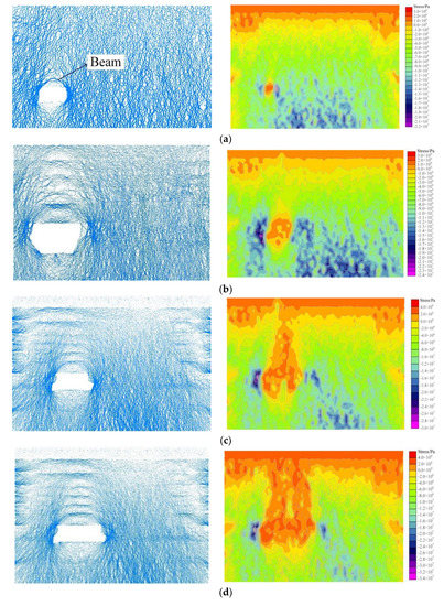 As can be seen from the Figure 23, when the coal seam mining after the original stress balance is broken, the overlying strata stress begins to adjust the distribution. The equilibrium state of the particles in the model was broken and began to move. The direction of the contact force chain between the particles began to change and gradually concentrated from the intricate to a certain direction. When the stope advances 10 m, the immediate roof above the mined-out area loses the support of coal, and the load cannot be transmitted directly downward and begins to be transmitted downward along both ends of the roof. Due to the short advance distance of the stope, only a few small fractured rock strata are generated inside the immediate roof. The displacement is small, and the structure is stable. The load on the beam above the stope is small, and the bending degree is small. At this time, the load is mainly concentrated on both sides of the coal wall. The weak force chain around the strong chain transfers the load to the surrounding area of the stope. The vertical stress peak of the overlying strata in the stope is about 22 MPa.