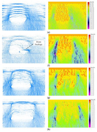 In the particle dynamics simulation, the force chain is the force frame of the whole overburden, bearing the external force load in the vertical and horizontal directions. The failure of the force chain indicates that the internal balance of the particles is broken, and the external force promotes the redistribution of the force chain until the new force chain is formed stably. A strong and quasi-linear shape, passing a larger share of the force, is called a strong chain. Deformation is weak and bear force is small, which is called the weak force chain, as shown in Figure 21 and Figure 22.