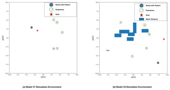Figure 6 shows simulation environments used to train the presented framework for co-navigation with only dynamic obstacles (Model V1) and with both static and dynamic obstacles (Model V2). Nvidia RTX 3090 was utilized for training both V1 and V2 models, with each model requiring 16 hours to complete 1000 epochs of training. In the following subsection, the experimental results are presented and discussed.