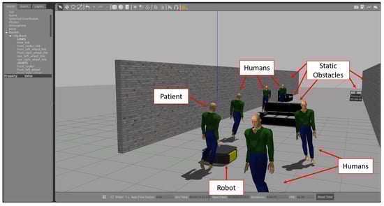 Safe and efficient navigation through human crowds is essential for RWAs in hospitals to move from one point to another while assisting the patients. Reinforcement learning (RL) techniques have been successfully used in a variety of tasks obstacle avoidance tasks. Wenzel et al. [31] used RL to avoid obstacles, such as walls, using the images from the camera as input. RL techniques have been used to navigate a robot through crowded workspaces [32]. Choi et al. [33] presented a study where they deployed an RL algorithm called soft actor–critic algorithm (SAC) [34] on a large mobile base robot, SR7, in a real-world setting to navigate both static and dynamic obstacles. To enhance the robot’s navigational capabilities, global path planners were integrated into the system. The efficacy of the developed SAC algorithm was compared with conventional path planning approaches, such as the timed elastic band (TEB) [35] and dynamic window approach (DWA) [36]. The study revealed that the SAC algorithm demonstrated superior generalization abilities in unfamiliar environments compared to traditional path-planning techniques. This finding underscores the need to explore obstacle avoidance using RL algorithms further. To train a reinforcement learning algorithm to find an optimal path through a crowded space, a simulation environment is required.