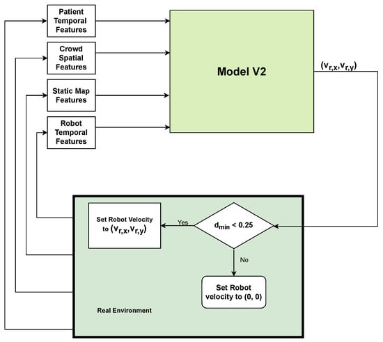 The model also outputs a predicted action value. The action value of the robot determines how good it is for the robot to be in a particular state or to do a certain action in that state. The concept of “how good” is described in terms of projected future rewards or, to be more accurate, expected returns. This video https://youtu.be/LqCMkvKuM8E, (accessed on 30 March 2023) shows the model V2 controlling the robot in Gazebo. On the left side, a terminal is shown that constantly prints the action value predicted by the model. Initially, when the robot faces an obstacle and moves toward the obstacle, the action value is negative. However, once the robot adjusts its path and avoids the furniture, the values are positive. The robot is able to reach its goal without losing contact with the patient. As evident from the data presented in Table 1 and Table 2, the contact loss rate of model V2 is not always zero. This highlights the importance of implementing measures to prevent contact loss, such as stopping the robot when the distance between the robot and the patient exceeds a certain threshold, such as 0.25 m. A flowchart illustrating the control system of the robot, including this safety feature, is depicted in Figure 8.