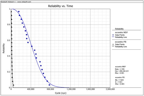 The data obtained from the laboratory reliability tests of furniture joints made of MDF and particleboard of 18 mm constituted the input base research material. The reliability of individual joints was calculated using Weibull++ software. The comparison of the reliability results for MDF and particleboard of 18 mm is presented in Figure 2.
