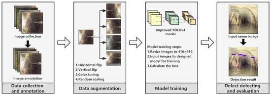 As shown in Figure 1, the overall workflow of this study contains: (1) sewer defect images collection and annotation; (2) image augmentation; (3) the proposed model training; and (4) defect detection and model performance evaluation.