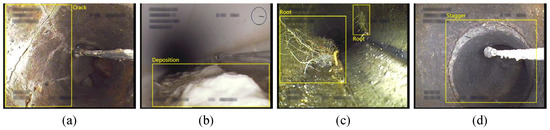 Sewer defect images labeled with bounding boxes: (a) crack; (b) deposition; (c) root; and (d) stagger.