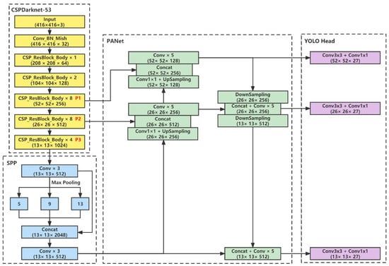 Architecture of YOLOv4. In the figure, the yellow part is the backbone network (CSPDarknet53), the blue part is the SPP module, the green part is the PANet module and the purple part is YOLO Head.