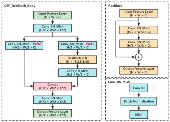 The overall structure of YOLOv4 is shown in Figure 5. Compared with YOLOv3, YOLOv4 has three main innovations in the network structure, including the backbone feature extraction network CSPDarknet53, the spatial pyramid pooling (SPP) module and the path aggregation network (PANet). CSPDarknet53 adds the Cross Stage Partial connections (CSP) module [23] on the basis of Darknet53. The CSP module can reduce computation and memory costs while improving the accuracy of the model. As shown in Figure 5, CSPDarknet53 consists of five residual structures CSP_ResBlock_Body, whose network structure is shown in Figure 6. After the input images pass through the backbone network, three feature maps of different scales P1, P2 and P3 are obtained, which are responsible for the detection of large, medium and small targets, respectively. These three feature maps will be sent to the Neck network for feature fusion.