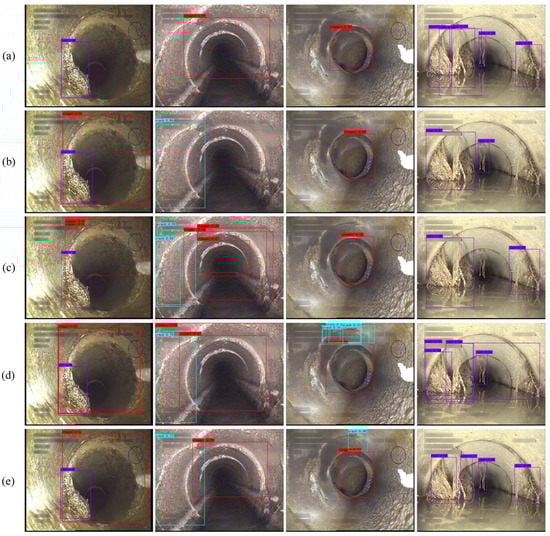 Some detection results of sewer defect images using different models: (a–d) show the detection results by YOLOv3, YOLOv7, Faster R-CNN and DETR, respectively; (e) shows the detection results by our model.