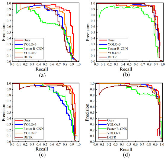 Precision–recall curves for different models: (a) P–R curve for crack; (b) P–R curve for deposition; (c) P–R curve for root; and (d) P–R curve for stagger.