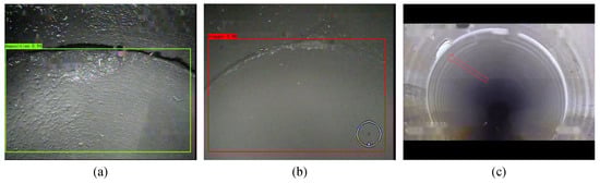 When the detection performance of the system is good enough, technicians can directly evaluate the state of the sewer pipe by watching the labeled video. The defects annotated using bounding boxes allow the technician to spend less time and effort in reviewing them. Moreover, the defect frames output by the system allows technicians to produce inspection reports without manually capturing and labeling images from the video. As shown in Figure 13c, the red arrow is manually annotated by technicians, which also takes a lot of time. Overall, this system can significantly speed up the detection efficiency of sewer defects, reduce the work intensity of technicians and has high accuracy, which provides a very important application value.