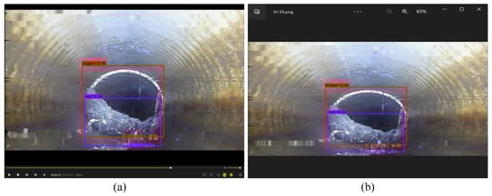 In this section, we propose a potential sewer defect detection system whose workflow is shown in Figure 14. Firstly, the CCTV robot collects the video data of the sewer pipes. Secondly, these videos will be fed directly into the system for the detection of specific defects. Finally, the system will output the final inspection results and give them to professional technicians for processing. The output of the system contains two parts, the labeled video and the defect frames extracted from the video. Figure 15 shows the labeled video and the extracted defect frames which come from an actual inspection project of an underground pipeline in Shanghai. It can be seen that in the labeled video, different defects are marked with bounding boxes of different colors, which makes it easy for technicians to review.