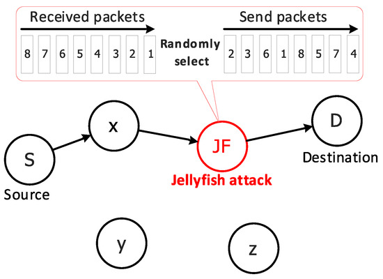 According to the authors of [21], Jellyfish attacks are described as three types of DoS attacks against mobile ad hoc networks (MANETs). They are classified as passive attacks, since they are launched from a network itself and ensure that both control and data protocols are compliant to make detection and protection extremely difficult tasks. By dropping, delaying, or reordering packets, the main goal of Jellyfish attacks is to reduce all flows’ throughputs and create congestion, which degrade network performance. Jellyfish attacks are categorized into three subcategories: Jellyfish reorder attacks, Jellyfish periodic drop attacks, and Jellyfish delay variance attacks. Table 1 shows a comparison between different jellyfish attack categories.