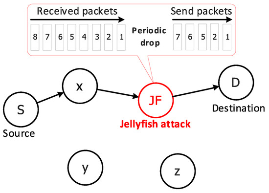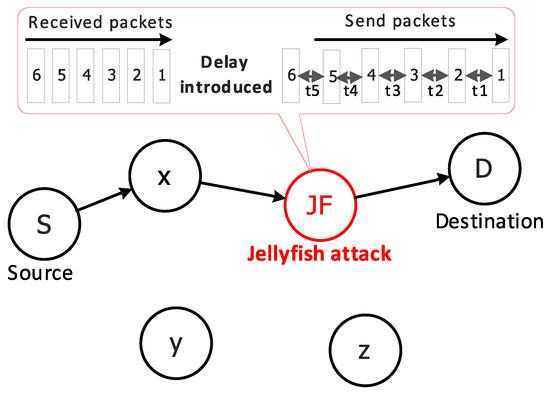Attacks such as Wormhole, Blackhole, and Sybil attacks seem to be very easily recognizable because the attacker node does not employ any protocol instructions and disrupts the routing protocol’s operating conditions by inserting bogus data, modifying information, and removing data in control packets [27,28]. Attacks such as Jellyfish attacks, on the other hand, are more difficult to detect since they respect the variety of protocol standards and disrupt normal network operations [29].