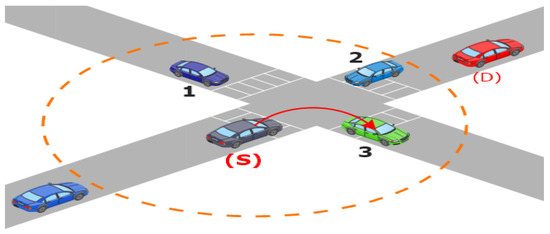 Routing in V2X networks is the process of selecting the best path for transmitting data between vehicles, infrastructures, and other devices in a network. The goal of routing in V2X networks is to ensure that data are transmitted efficiently, reliably, and securely [8]. There are several routing protocols that can be used in V2X networks. Topology- and location-based routing protocols are the two main categories of routing protocols in V2X networks [9]. Due to the high mobility of vehicles, location-based (or geographic) protocols also outperform traditional ad hoc routing protocols [10,11]. The most important aspect of vehicle knowledge is location. Every node is effectively required to keep track of both its own location and that of its neighboring nodes [12]. In order to find a route to a destination, geographic routing systems use the geographic coordinates offered by a positioning system, such as the geographic positioning system (GPS) [13]. Among these protocols is the greedy perimeter stateless routing protocol (GPSR) [14], which is one of the most well-known and researched geographic routing methods. It assumes that every node is aware of its own location coordinates and periodically broadcasts them to its one-hop neighbors. GPSR uses perimeter forwarding and greedy forwarding strategies to route packets to their intended destinations. The next-hop neighbor node closest to the destination is chosen by the forwarding mechanism using a greedy algorithm. When greedy forwarding fails to route packets, perimeter forwarding will be used to forward packets [15].