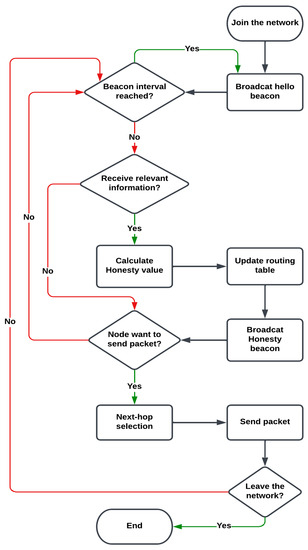 The overall Honesty value of a node is calculated by the communication behavior of packet delivery between nodes which is represented in the packet loss rate, delay, packet reordering, and confidence of the node. The Honesty value is set in a range from 0 to 1, where 0 is completely dishonest and 1 is completely honest. Because the network has a dynamic topology and is self-organizing, nodes will join and leave the network at random. As a result, node Honesty must be updated in real time. This value changes at any given time according to the transactions between nodes. An overview of the entire work of the proposed protocol is presented in Figure 6. The presentation of the Honesty variables as well as the technique of next-hop selection employed in the proposed protocol take up the remainder of this section.