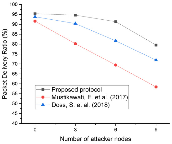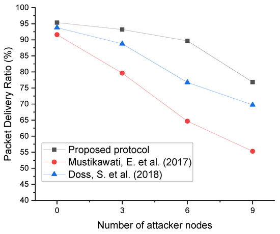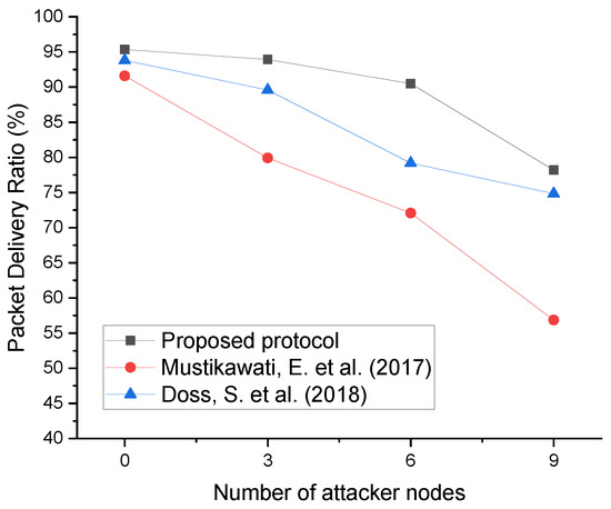 The authors of [37] used an intrusion detection system (IDS) algorithm to prevent ad hoc on-demand distance vector (AODV) routing protocols against Jellyfish and Blackhole attacks in VANETs. They compare the conditions without attacks to those with Blackhole and Jellyfish attacks when analyzing the AODV routing protocol with and without an IDS algorithm. The results of the simulation show that the addition of the IDS algorithm increases the performance of the network based on the quality of service (QoS) parameters: packet delivery ratio (PDR), throughput, and end-to-end delay compared with conditions under attacks.