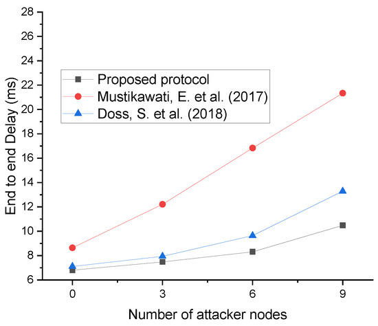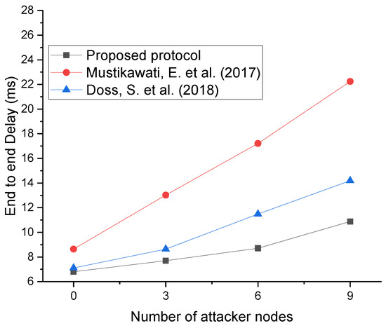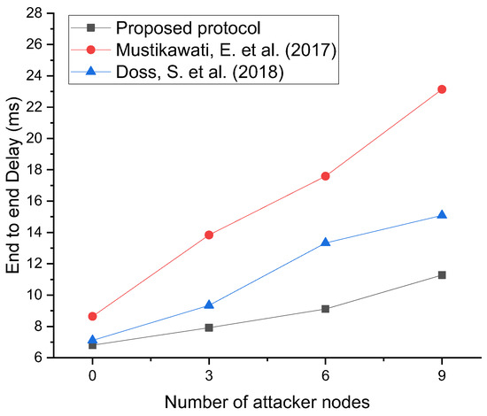 - Sachdeva, S.; Kaur, P. Detection and Analysis of Jellyfish Attack in MANETs. In Proceedings of the 2016 International Conference on Inventive Computation Technologies (ICICT), Coimbatore, India, 26–27 August 2016; Volume 2, pp. 1–5. [Google Scholar]