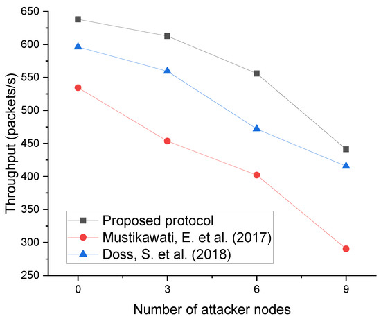 Simulation research examining the impact of Jellyfish attacks clearly reveals that they have a significant influence on throughput and end-to-end delay [30]. To detect and mitigate the malicious activities of different Jellyfish attack variations, the research community has put significant effort into developing detection and countermeasure approaches, but so far no approach has been developed to protect against all three types of Jellyfish attacks together. A proposed solution is to identify Jellyfish attacks by using a timer to measure delay and then finding a different route as well as blocking the attacker node in order to avoid delay variance attacks and improve throughput [31]. A modified hash function and time–space cryptography are also used to determine whether packet reordering is being carried out as a result of a Jellyfish attack, and, if so, to prevent the attack and improve network performance [32].