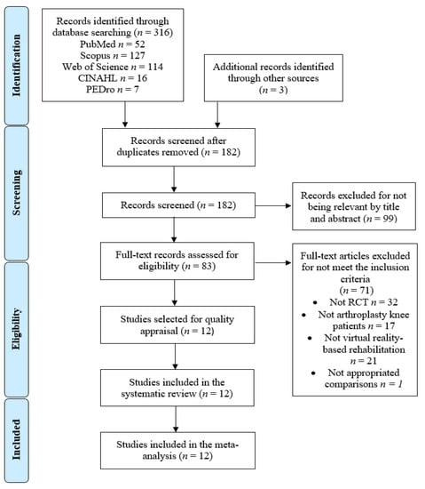 Three hundred sixteen references were retrieved in the initial searches in databases (PubMed n = 52, SCOPUS n = 127, WOS n = 114; CINAHL n = 16, and PEDro n = 7), and 3 additional records were identified through other sources. After deleting 134 references as duplicates, 182 studies were screened by title and abstract, and 99 were deleted for not being relevant to the topic. Later, 83 studies were assessed in detail for eligibility, and 71 studies were removed for not meeting the inclusion criteria (reasons in Figure 1). Finally, 12 RCTs [58,59,60,61,62,63,64,65,66,67,68,69] were included in our systematic review with meta-analysis, and all provided data were meta-analyzed. Figure 1 shows the PRISMA flow chart of the study selection process.