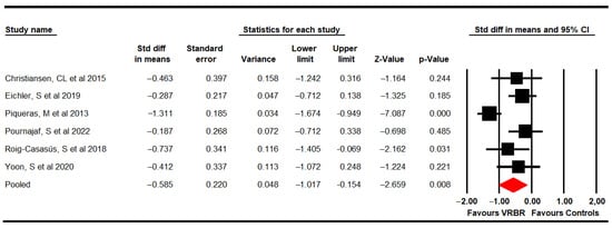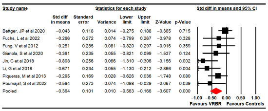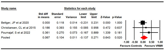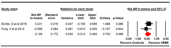 Subgroup analysis reported no effect of the non-immersive VRBR when it was used alone [58,69] (SMD = 0.1; 95% CI −0.22 to 0.42; p = 0.54), compared to CT.