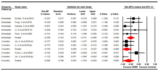 At 3 months of follow-up (with data from 2 studies [67,68]), the effect of VRBR was more than the conventional approaches (SMD = −0.44; 95% CI −0.72 to −0.16; p = 0.002) (Table 4). Subgroup analysis according to specific comparisons showed that at immediate assessment, the use of VRBR in combination with CT [63,66,67] (SMD = −0.6; 95% CI −0.9 to −0.3; p < 0.001) was major that the isolated use of VRBR [58,64,65,68,69] (SMD = −0.22; 95% CI −0.4 to −0.04; p = 0.014), both in comparisons with CT (Table 4 and Figure S2). Finally, we observed that in reducing knee pain, the effect of VRBR using immersive VR devices [63,66,67] (SMD = −0.6; 95% CI −0.9 to −0.3; p < 0.001) might be better than non-immersive VR devices [58,64,65,68,69] (SMD = −0.22; 95% CI −0.4 to −0.04; p = 0.014).