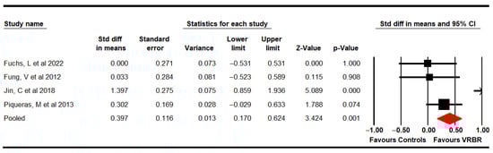 The meta-analysis, according to the follow-up assessment, could not be performed. Our findings showed that the combined use of immersive VRBR [63,66] (SMD = 0.69; 95% CI 0.31 to 1.07; p < 0.001) is better than the isolated use of non-immersive VRBR [64,68] (SMD = 0.23; 95% CI −0.05 to 0.52; p = 0.11), both in comparisons to CT (Figure S5).