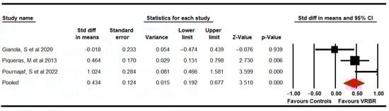 Forest plot of the immediate effect of VRBR on aerobic capacity [62,64].
