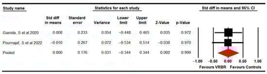 Two studies [65,69] reported data from 141 participants to assess the immediate effect of VRBR in improving functional independence compared to CT. No statistically significant differences were found between therapies (SMD = 0; 95%CI −0.34 to 0.34; p = 0.99) (Table 4, Figure 9) without heterogeneity (I2 = 0%; Q = 0; df = 1; p = 0.95).