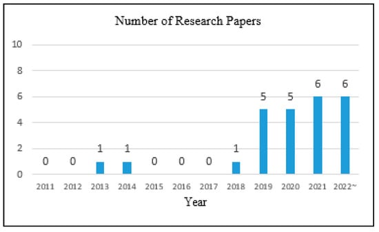Figure 2 illustrates the number of relevant research papers by year, where the following observations can be made: First, no research papers on human-focused DT for OSH had been published before 2013, which indicates that both concepts of DT and its technological enablers were immature in the early 2010s, since the vision of Industry 4.0 was suggested in 2013 [12,16]. Second, most of the relevant research papers (22 out of 25) were published in the last four years, while only three papers were published from 2013 to 2018. Increasing interest is being paid to human-focused DT for OSH, and a more comprehensive range of such applications has become feasible owing to recent modern information and communication technologies (ICTs). Moreover, this trend is similar to those reported in recent surveys on DT [43,44].
