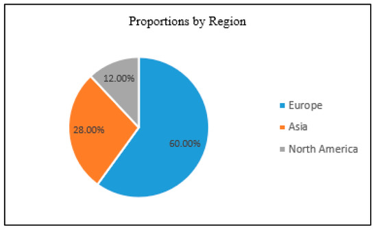 Figure 3 shows the geographical distribution of the research papers, where the nationality of a research paper is determined according to the location of the first author’s affiliations. Only three continents, Europe, Asia, and North America, have one or more relevant research papers, which implies that human-focused DT for OSH is still an emerging research topic. Among the three continents, human-focused DT for OSH is most actively studied in Europe, and 60% of the research papers (15 out of 25) were authored by first authors from Europe. Publications from Asia and North America account for 28% and 12% of the relevant research papers, respectively.