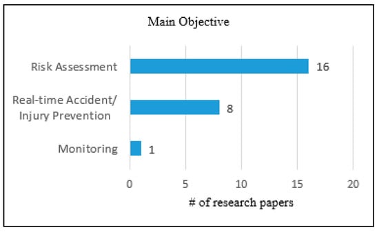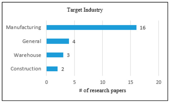 Figure 6 shows the number of relevant publications based on target industry (i.e., manufacturing, general, warehouse, and construction). The analysis shows that manufacturing is the most popular application domain for human-focused DT for OSH. Clearly, human-focused DTs for OSH are based on Industry 4.0 technologies, and a smart factory is a key part of the agenda of the Industry 4.0 era. Thus, the manufacturing industry is the most important application domain for such technologies. Similarly, this is also the case for human-focused DT for OSH [4,8,17,24,27,28,29,32,33,34,35,37,38,40,41,42].