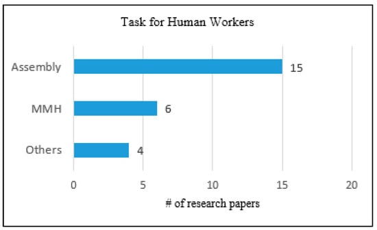 In Figure 7, the tasks performed by human workers in existing applications are classified into four categories (i.e., assembly, manual material handling (MMH), ad hoc motion, and others). The majority of the applications were designed to create and utilize DT for human workers performing assembly tasks that involve combining a number of parts to obtain an end product [4,8,17,24,27,28,31,32,33,34,35,38,40,41,42]. Most of these applications target manufacturing applications.