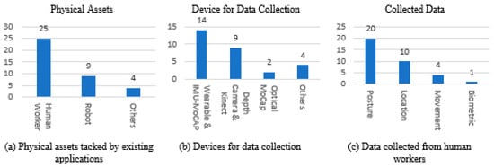 The physical assets from which existing applications collect digital data are summarized in panel (a) of Figure 9, where a single application can collect data from two or more kinds of assets. First, human workers are important physical assets in all of the 25 existing applications, which is quite natural since the scope of our survey is limited to DT applications that utilize digital data collected from human workers.