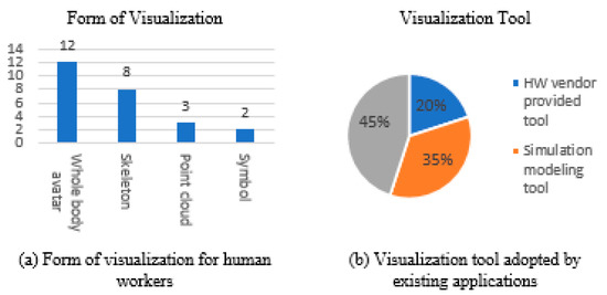 To provide a visual representation for human workers, modern visualization tools that can process or reflect the collected data are required. Unfortunately, detailed descriptions of these visualization tools are missing in some previous research papers. However, from the papers with detailed descriptions, the visualization tools that provide simulated environments can be grouped into three categories: custom applications, simulation modeling tools, and HW vendor-provided tools.