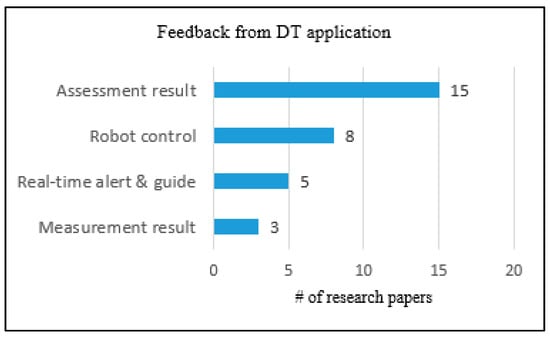 Human-focused DT applications for OSH should support data analysis and feedback helpful for the prevention of occupational injuries and illness. Figure 11 summarizes the sorts of feedback provided by existing applications. An ‘assessment result’ is obtained following an analysis or calculation using the data collected from a workplace, while a ‘measurement result’ indicates the collected data. ‘Robot control’ refers to the associated commands or signals generated by a DT application to control industrial robots if required. ‘Real-time alert and guide’ is a type of feedback containing information about risks and hazards identified in the workplace, and requesting human workers or managers to take proper actions.