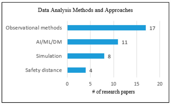 In Figure 12, important data analysis methods and approaches for human-focused DT applications for OSH are classified into four groups: observational methods, AI/machine learning (ML)/data mining (DM), simulation, and safety distance.