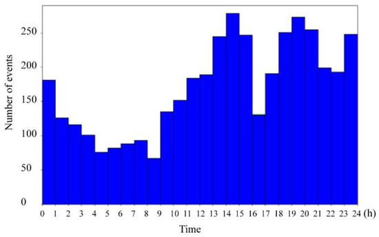 As shown in Figure 3, the microseismic events in orebody I# were mainly distributed between 13:00 and 16:00 in the morning shift and 18:00 and 21:00 in the middle shift, intercepting these two periods for curve fitting.