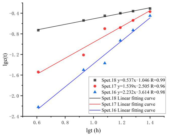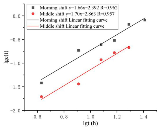 The was calculated from the distribution of microseismic events over time. Using the microseismic event time range t as the horizontal coordinate (here, t was chosen as 0 to 4, 8, 12, 16, 20, 24) and as the vertical coordinate for linear fitting, the relationship between for the morning and mid-shift, as shown in Figure 4, had a self-similarity coefficient in the range of 0.955–0.985, indicating a good linear correlation. On this basis, as shown in Figure 5, the distribution of the microseismic time for the subsequent three days was counted, and a fitting analysis was performed.