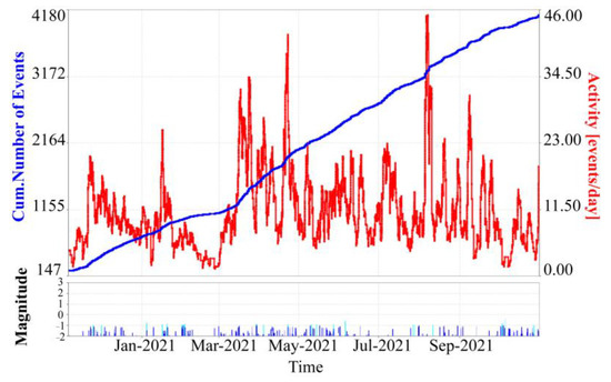 Research on the temporal characteristics of microseismic methods has achieved effective results through continuous innovation. Based on the monitoring results, advanced theories, such as geometric theory and convolutional neural networks, are effective means of analyzing the temporal distribution characteristics of microseismic monitoring events [20,21]. Previous studies have found that the number of rock-mass fractures obeys three-dimensional fractal distribution [22]. The initial value of a two-dimensional fractal distribution has a linear relationship with the initial value of a three-dimensional fractal distribution. Fractal dimension, as the quantitative characterization and basic parameter of the theory, is one of the important principles of fractal theory. The size–frequency distributions for islands, earthquakes, fragments, ore deposits, and oil fields often satisfy this relation [23,24,25]. Multi-scale materials, such as concrete and rocks, have self-similarity whose distributions have a power-law form [26,27,28,29,30]. Higher porosity samples give different fractal dimensions for upper and lower fracture surfaces [31]. The permeability has an exponential relationship with the fractal dimension of fracture center and fracture length [32]. It was found in laboratory research that acoustic emission count rates during failure for all loading steps exhibit fractal features [33,34,35]. The results of engineering research indicated that the energy distribution of microseismic events during the development of immediate rock bursts has a fractal structure [36].