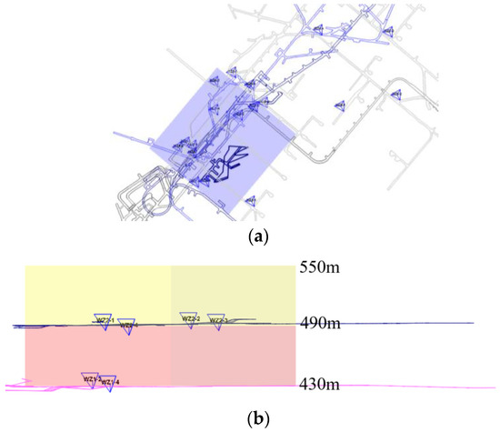 Spatial distribution of microseismic events in the I# mineral belt area: (a) top view; (b) east view. Different colored balls indicate different monitored dates; triangles indicate sensor locations; 370 m, 430 m, 490 m, 610 m, 670 m. indicate different mining levels.
