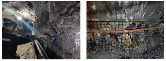 According to the actual feedback from the site, the Maoping mine has experienced several smaller ground pressure (or rock burst) events at the top of the mining working face roadway. When subjected to high stresses at depth, whether inherent or caused by mining activity, rock fractures can occur within the support structure. This can result in a reduced bearing capacity of the rock body and detachment of supporting structures, such as pipe slit anchors, from the fractured rock mass. The prolonged action leads to the damage of the 433 m quasi-slope path of the I-8# orebody belonging to this type, as shown in Figure 9. With an increase in mining depth and the superposition of deep high-pressure water, this characteristic of deep fractured rock bodies becomes more prominent.