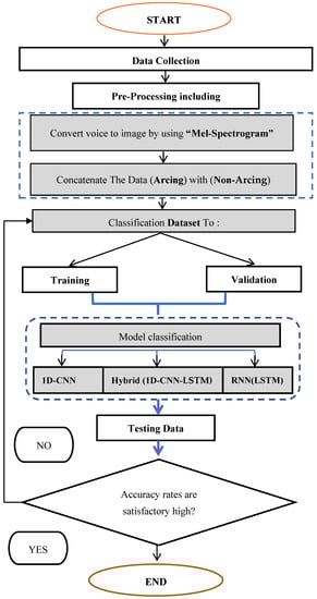 In this study, the pre-processing step was very important because it turned the data collected into a format that deep learning algorithms could use. This process involved converting the waveform audio data into an image format using the Mel-Spectrogram technique. Mel-Spectrogram is a widely used method to extract spectral features from audio signals. This process involves transforming the sound signal into a spectrogram, which is essentially a 2D matrix of intensities that represent the frequency spectrum of the sound signal. After transforming the data into images, the data was then further transformed into a matrix format to comply with the requirements of the Python programming language, which was used for the implementation of the machine learning algorithms. This transformation allowed the data to be organized and structured in a way that could be processed by the algorithms. The arcing and non-arcing data were combined and then split into three phases: training, validation, and testing. The training phase comprised the largest proportion of the dataset (70%), while the remaining 30% of the dataset was split equally for each of the validation (15%) and testing (15%) phases. It is important to note that the non-arcing data in this study was not limited to just one type of fault but rather included a range of other faults such as corona, tracking, mechanical, and normal faults. Additionally, the pre-processing and flowchart were implemented using the Google Colab environment.