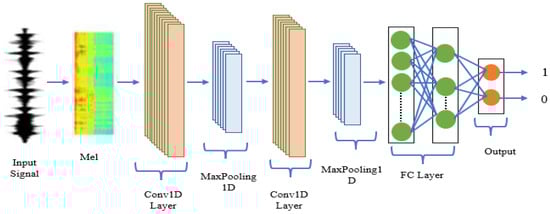 In this study, 1D convolution operations were used to extract representative features of arcing and non-arcing in both the time and frequency domains. The architecture used was a basic 1D-CNN with convolutional layers, filters, MaxPooling, a fully connected layer, and a classification layer. Here, the 1D-CNN can match the one-dimensional characteristics of datasets in the time and frequency domains. To introduce nonlinearity, the rectified linear unit (RELU) was utilized as the activation function. Additionally, batch normalization and dropout were used to normalize inputs and prevent overfitting. Although deep CNNs have gained prominence in image classification competitions like ImageNet [5,6,7,8,9,10,11,12,13,14,15,16,17,18,19,20,21,22,23,24,25,26,27,28,29,30,31,32,33,34,35,36,37,38,39,40,41,42,43,44,45,46,47,48,49], they are primarily used for large-scale 2D visual databases such as video analysis and image identification. However, there are not many uses for 1D sequence data in forecasting and classification issues. Arcing and non-arcing categorization can be seen as a serial modeling process, making short and concise 1D-CNNs ideal for real-time and limited applications [50]. Equation (1) through (3) and Figure 2 illustrate the convolution layers, filters, and fully connected layer utilized in the 1D-CNN architecture. In this study, one-dimensional feature maps were used to match the one-dimensional nature of the datasets in the time and frequency domains. The 1D-CNN architecture, combined with the Mel-Spectrogram transformation, was able to identify arcing faults in switchgear with high accuracy.