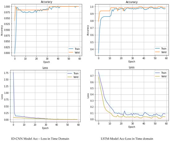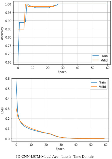 The accuracy and loss curves are shown in the time domain for the 1D-CNN, LSTM, and 1D-CNN-LSTM models.