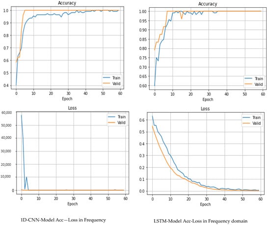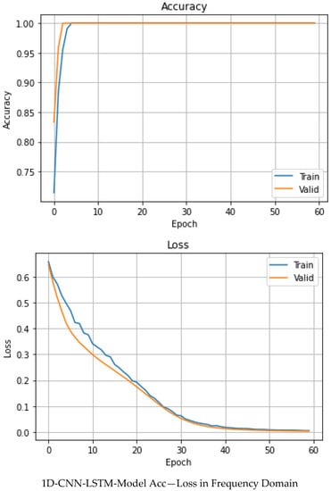 The accuracy and loss curves are shown in the frequency domain for the 1D-CNN, LSTM, and 1D-CNN-LSTM models.