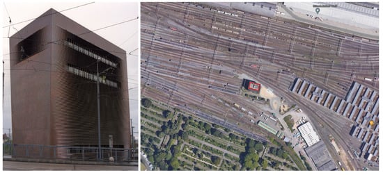 The building to be studied was the Signal Box auf dem Wolf (47.57° N and 7.35° E), surrounded by the railway tracks of Basel Station, Switzerland. The Signal Box auf dem Wolf was completed in 1994 and comprises five floors with a height of 24 m (the total floor area is 935 m−2). The width of the building is 11.2 m and the length is 17.2 m. Machinery and equipment occupy most of the building for train services. A characteristic of this building is that all facades are surrounded by copper bands, so the windows are not visible. This is because the main purpose of the building was to store machinery, thus windows were not required. However, there are windows in the space where the building managers reside; therefore, when windows exist on the outer wall of the building, the angle of the copper bars is changed to bring natural light from the outside to the interior (Figure 2 left). Additionally, the external environment of the building is characterized by the absence of other surrounding buildings (Figure 2 right). Because of these characteristics, we selected the Signal Box auf dem Wolf as the research subject. Moreover, the metallic material comprising the elevation of the Signal Box auf dem Wolf can be replaced by a solar panel. Furthermore, the Signal Box auf dem Wolf can maximize the energy production effect of the solar panels, because there is no shadow interference from the surrounding buildings. If the moveable solar panel pursued in this study can be installed in the Signal Box auf dem Wolf to produce renewable energy, it will not only increase the energy independence of the building, but also maximize the current mechanical image.