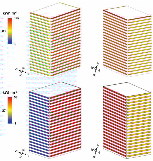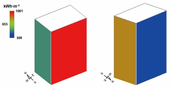 The Signal Box auf dem Wolf has a south-west-facing facade, and the main facade of the building is tilted 30° clockwise from the south. To attach the solar panel facade system to a building elevation, a suitable elevation of the building must be selected. Insight, a Revit software plug-in optimized for solar energy simulation, was used to select the elevation of the building where the solar panels would be installed. The building was implemented using Revit software, and solar energy simulation for the building elevation was conducted according to the latitude and longitude values of the city of Basel, based on data from 1 January to 31 December 2022. Figure 3 shows the results of the solar radiation simulation using the Insight program. The building elevation with the largest cumulative solar radiation appeared in the order of south, east, west, and north. A prerequisite for solar panel installation is securing peak sun hours, which is the time at which sunlight begins to shine directly on the solar panel. While the amount of sunlight received by the panels is important, a more accurate representation of the amount of energy the panels can produce is the peak sun hours. It is important to note that “peak sun hours” are different from “hours of daylight”. Peak sun hours refer specifically to the amount of solar energy available in an area during a typical day. A peak sun hour is an hour during which the intensity of sunlight is 1000 Wh·m−2 [51,52]. Under these preconditions, the solar panel facade systems were installed at the south, east, and west elevations, except for the north side, where peak sun hours cannot be secured.