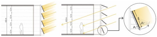 Representative studies on solar panels in architectural design are classified according to the size of the solar panel module attached to a building. First, if the photovoltaic module used in the study is macro-sized, the photovoltaic panel is directly installed on the building elevation. To derive the maximum energy production using solar panels attached to the building elevation, a study was conducted to determine the size of the building’s outer wall using a parametric design [42]. This study can play an important role in determining the basic form of a building suitable for a given site. There has also been an empirical study on the production of building elevations of a certain size comprising solar panels. A solar panel was manufactured for movement, and the energy produced by the solar panel was measured at certain angles. The optimal angle of the solar panel was derived based on the maximum amount of energy generated by the solar panel [43,44,45]. Secondly, considering micro-sized solar modules, a study using sunshades installed on windows has been reported previously. When a solar panel is integrated with a sunshade, it is planned for the size of the solar panel to be small. A study was conducted to measure energy production using the size and spacing of the solar panels to be placed on the sunshade and at various angles exposed to sunlight [46,47]. Additionally, research on the development of sunshades with attached solar panels is characterized by the fact that the subject of research is not limited to solar panels but expands to the interior space of buildings. As the area of the solar panel attached to the sunshade is small, increasing the energy utilization of the interior space of buildings using sunshades is considered in addition to optimal energy production [48].