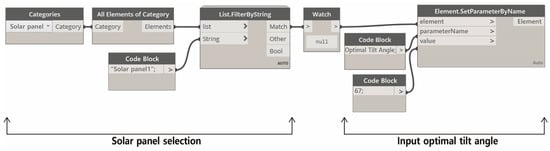The solar energy simulation for three faces of the Signal Box auf dem Wolf according to the optimal tilt angle (βo) was conducted from January to December 2022. The solar panel was implemented using Revit software, and the placement of the solar panels according to the optimal tilt angle was controlled using Dynamo’s algorithm. The algorithm configuration involves entering the angle of the selected solar panel after selecting it. Designate the solar panel to be moved in ‘Code Block’ of <Solar panel selection> (Figure 5 left). In <Input optimal tilt angle>, input the parameter name and optimal tilt angle in two ‘Code Blocks’ (Figure 5 right). Figure 5 shows the algorithm for the solar panel with a 67° optimal tilt angle with the best solar energy generation efficiency in December 2022.