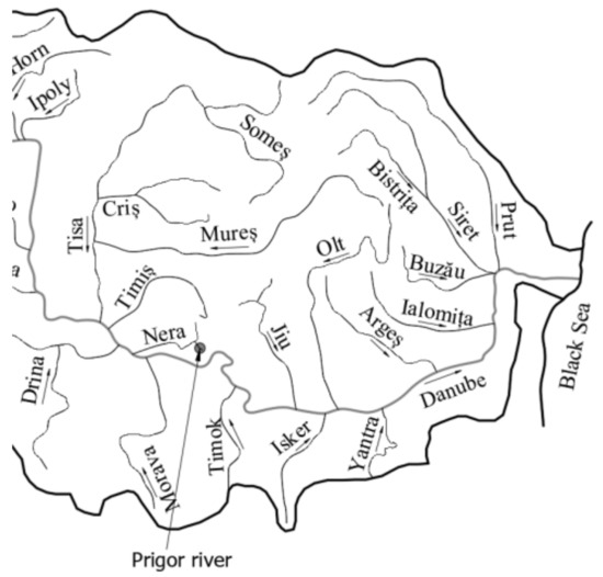 The Prigor River is the left tributary of the Nera River, and it is located in the south-western part of Romania, as shown in Figure 3. The geographical coordinates of the location are 44°55′25.5″ N 22°07′21.7″ E.
